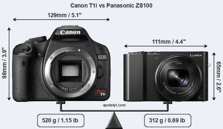 The physical size and weight of the Canon T1i and the Panasonic ZS100 are illustrated in the side-by-side display below. The two cameras are presented according to their relative size. Three consecutive perspectives from the front, the top, and the back are available. All width, height and depth dimensions are rounded to the nearest millimeter.