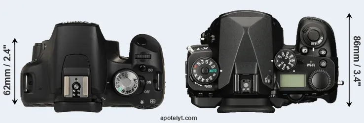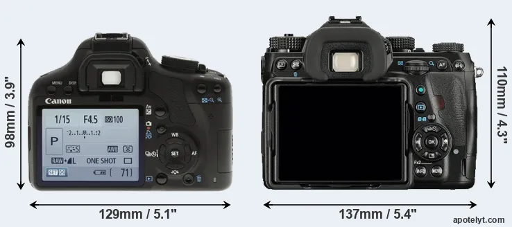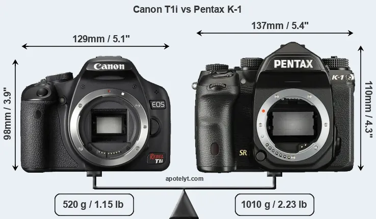 The side-by-side display below illustrates the physical size and weight of the Canon T1i and the Pentax K-1. The two cameras are presented according to their relative size. Three consecutive views from the front, the top, and the rear side are shown. All width, height and depth dimensions are rounded to the nearest millimeter.