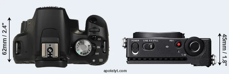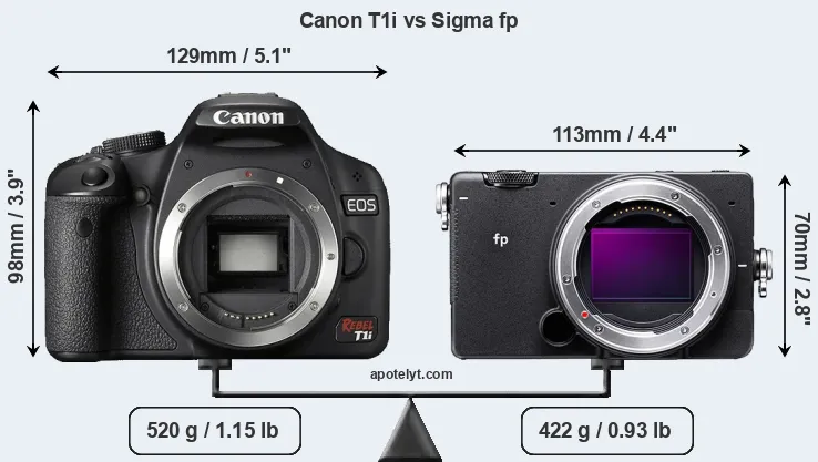 The physical size and weight of the Canon T1i and the Sigma fp are illustrated in the side-by-side display below. The two cameras are presented according to their relative size. Three successive views from the front, the top, and the rear are shown. All width, height and depth measures are rounded to the nearest millimeter.