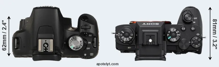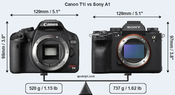The side-by-side display below illustrates the physical size and weight of the Canon T1i and the Sony A1. The two cameras are presented according to their relative size. Three consecutive views from the front, the top, and the rear side are shown. All width, height and depth measures are rounded to the nearest millimeter.