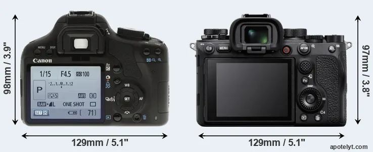 The above size and weight comparisons are to some extent incomplete since they do not consider the interchangeable lenses that both of these cameras require. A larger imaging sensor will tend to go along with bigger and heavier lenses, although exceptions exist. You can compare the optics available for the two cameras in the Canon EF Lens Catalog (T1i) and the Sony FE Lens Catalog (A1). Mirrorless cameras, such as the A1, have moreover the advantage that they can use many lenses from other systems via adapters, as they have a relatively short flange to focal plane distance.