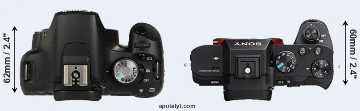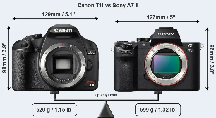 The physical size and weight of the Canon T1i and the Sony A7 II are illustrated in the side-by-side display below. The two cameras are presented according to their relative size. Three consecutive perspectives from the front, the top, and the back are available. All width, height and depth dimensions are rounded to the nearest millimeter.