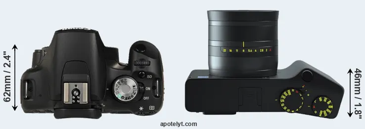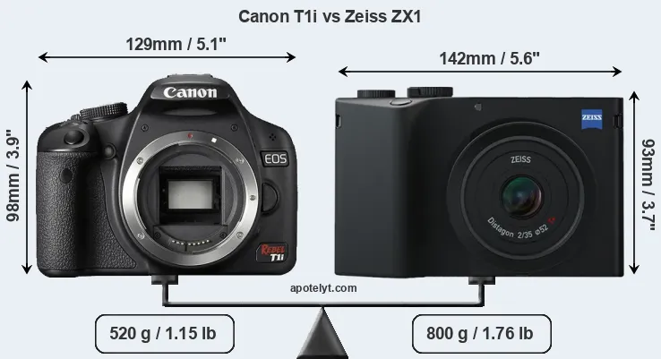 An illustration of the physical size and weight of the Canon T1i and the Zeiss ZX1 is provided in the side-by-side display below. The two cameras are presented according to their relative size. Three successive views from the front, the top, and the rear are shown. All width, height and depth dimensions are rounded to the nearest millimeter.