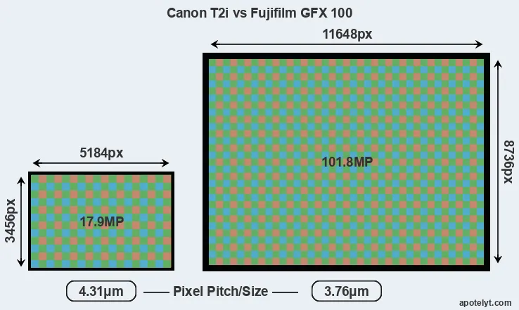 | Sensor Specs | Canon T2i | Fujifilm GFX 100 |