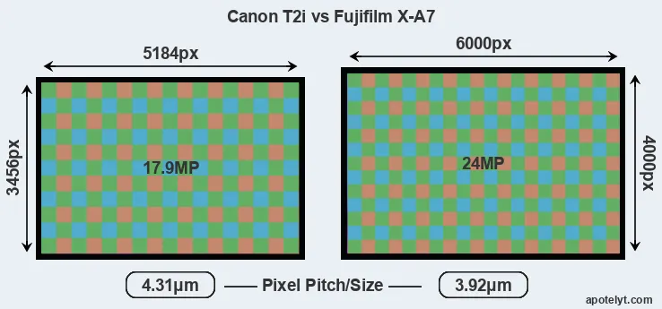 | Sensor Specs | Canon T2i | Fujifilm X-A7 |