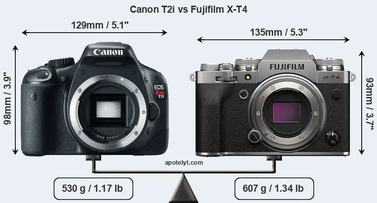 The side-by-side display below illustrates the physical size and weight of the Canon T2i and the Fujifilm X-T4. The two cameras are presented according to their relative size. Three successive views from the front, the top, and the rear are shown. All width, height and depth dimensions are rounded to the nearest millimeter.