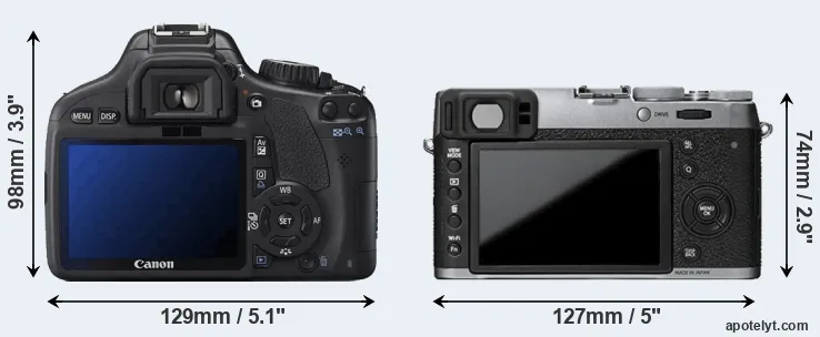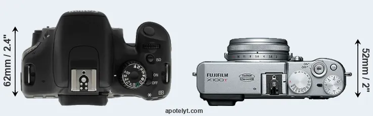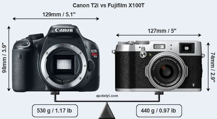 An illustration of the physical size and weight of the Canon T2i and the Fujifilm X100T is provided in the side-by-side display below. The two cameras are presented according to their relative size. Three successive views from the front, the top, and the rear are shown. All width, height and depth dimensions are rounded to the nearest millimeter.