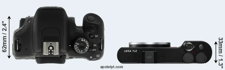 The side-by-side display below illustrates the physical size and weight of the Canon T2i and the Leica TL2. The two cameras are presented according to their relative size. Three successive views from the front, the top, and the rear are shown. All width, height and depth dimensions are rounded to the nearest millimeter.