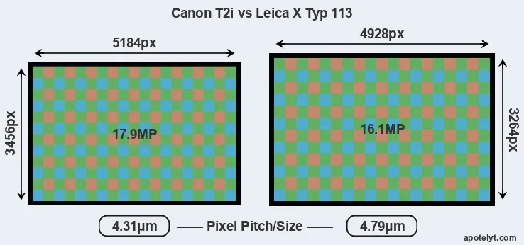 Despite having a smaller sensor, the Canon T2i offers a higher resolution of 17.9 megapixels, compared with 16.1 MP of the Leica X Typ 113. This megapixels advantage comes at the cost of a higher pixel density and a smaller size of the individual pixel (with a pixel pitch of 4.31μm versus 4.79μm for the X Typ 113). Moreover, it should be noted that the X Typ 113 is much more recent (by 4 years and 7 months) than the T2i, and its sensor will have benefitted from technological advances during this time that further enhance the light gathering capacity of its pixel-units.