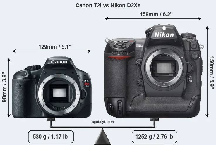 If the front view area (width x height) of the cameras is taken as an aggregate measure of their size, the Nikon D2Xs is considerably larger (87 percent) than the Canon T2i. Moreover, the D2Xs is substantially heavier (136 percent) than the T2i. It is noteworthy in this context that the D2Xs is splash and dust-proof, while the T2i does not feature any corresponding weather-sealing.