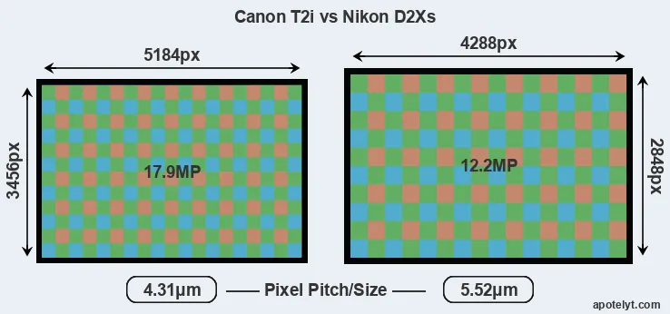 Despite having a smaller sensor, the Canon T2i offers a higher resolution of 17.9 megapixels, compared with 12.2 MP of the Nikon D2Xs. This megapixels advantage comes at the cost of a higher pixel density and a smaller size of the individual pixel (with a pixel pitch of 4.31μm versus 5.52μm for the D2Xs). However, it should be noted that the T2i is much more recent (by 3 years and 8 months) than the D2Xs, and its sensor will have benefitted from technological advances during this time that make it possible to gather light more efficiently.