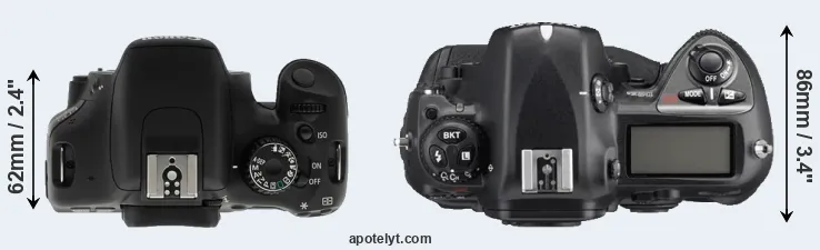 An illustration of the physical size and weight of the Canon T2i and the Nikon D2Xs is provided in the side-by-side display below. The two cameras are presented according to their relative size. Three consecutive views from the front, the top, and the rear side are shown. All width, height and depth measures are rounded to the nearest millimeter.