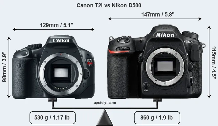 An illustration of the physical size and weight of the Canon T2i and the Nikon D500 is provided in the side-by-side display below. The two cameras are presented according to their relative size. Three successive views from the front, the top, and the rear are shown. All width, height and depth measures are rounded to the nearest millimeter.
