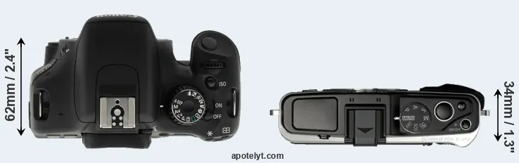 An illustration of the physical size and weight of the Canon T2i and the Olympus E-P3 is provided in the side-by-side display below. The two cameras are presented according to their relative size. Three consecutive perspectives from the front, the top, and the back are available. All width, height and depth measures are rounded to the nearest millimeter.