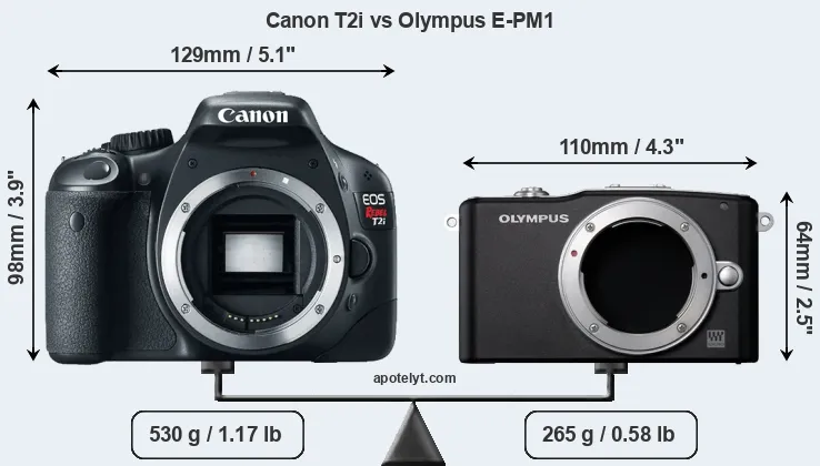The physical size and weight of the Canon T2i and the Olympus E-PM1 are illustrated in the side-by-side display below. The two cameras are presented according to their relative size. Three consecutive perspectives from the front, the top, and the back are available. All width, height and depth dimensions are rounded to the nearest millimeter.