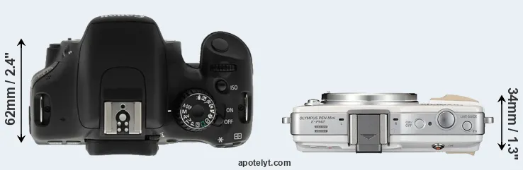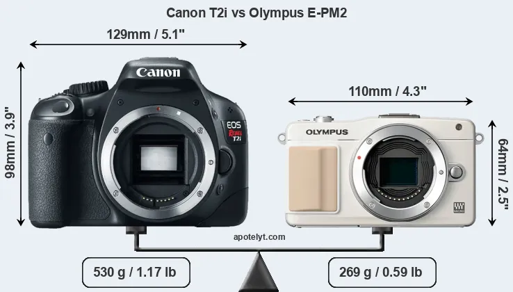 The physical size and weight of the Canon T2i and the Olympus E-PM2 are illustrated in the side-by-side display below. The two cameras are presented according to their relative size. Three successive views from the front, the top, and the rear are shown. All width, height and depth dimensions are rounded to the nearest millimeter.