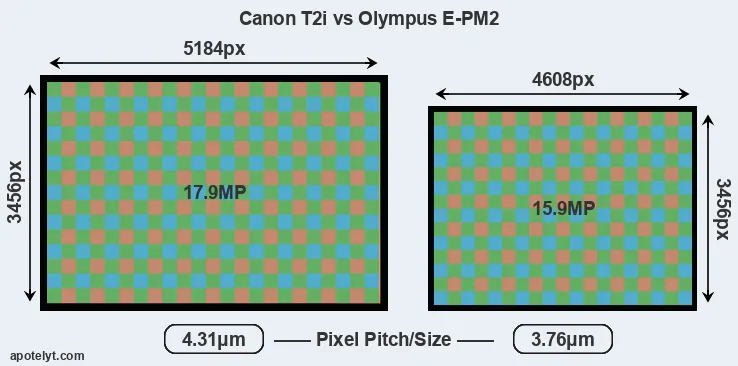 With 17.9MP, the T2i offers a higher resolution than the E-PM2 (15.9MP), but the T2i nevertheless has larger individual pixels (pixel pitch of 4.31μm versus 3.76μm for the E-PM2) due to its larger sensor. However, the E-PM2 is a much more recent model (by 2 years and 7 months) than the T2i, and its sensor will have benefitted from technological advances during this time that further enhance the light gathering capacity of its pixels.