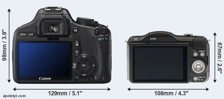 The side-by-side display below illustrates the physical size and weight of the Canon T2i and the Panasonic GF5. The two cameras are presented according to their relative size. Three consecutive perspectives from the front, the top, and the back are available. All width, height and depth measures are rounded to the nearest millimeter.