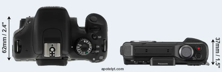 The side-by-side display below illustrates the physical size and weight of the Canon T2i and the Panasonic TS7. The two cameras are presented according to their relative size. Three consecutive views from the front, the top, and the rear side are shown. All width, height and depth measures are rounded to the nearest millimeter.