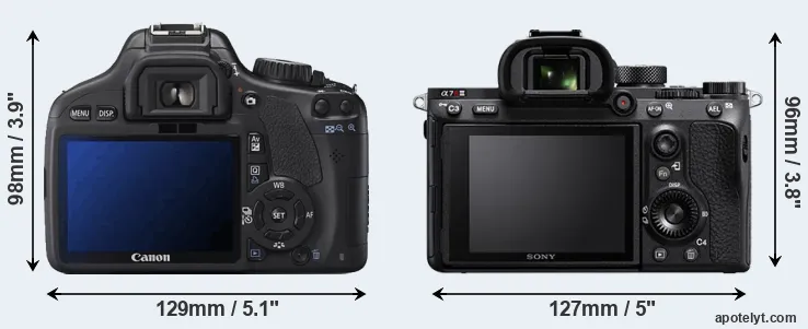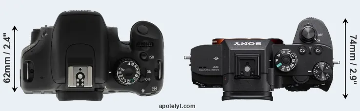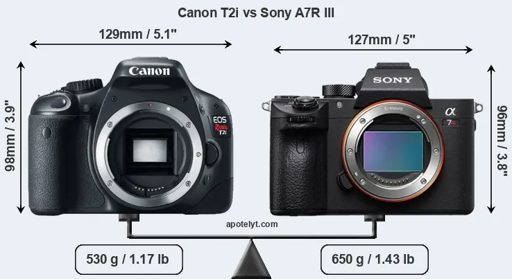 The side-by-side display below illustrates the physical size and weight of the Canon T2i and the Sony A7R III. The two cameras are presented according to their relative size. Three consecutive perspectives from the front, the top, and the back are available. All width, height and depth measures are rounded to the nearest millimeter.