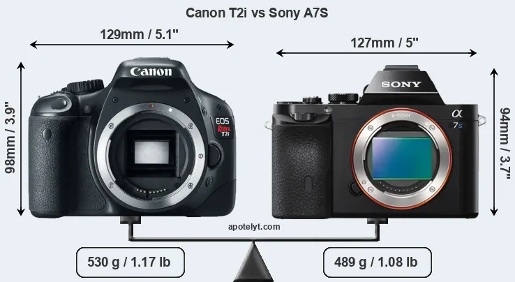 If the front view area (width x height) of the cameras is taken as an aggregate measure of their size, the Sony A7S is notably smaller (6 percent) than the Canon T2i. Moreover, the A7S is markedly lighter (8 percent) than the T2i. It is noteworthy in this context that the A7S is splash and dust-proof, while the T2i does not feature any corresponding weather-sealing.