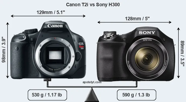 An illustration of the physical size and weight of the Canon T2i and the Sony H300 is provided in the side-by-side display below. The two cameras are presented according to their relative size. Three consecutive perspectives from the front, the top, and the back are available. All width, height and depth dimensions are rounded to the nearest millimeter.