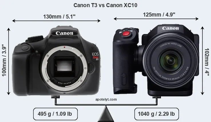 The physical size and weight of the Canon T3 and the Canon XC10 are illustrated in the side-by-side display below. The two cameras are presented according to their relative size. Three consecutive views from the front, the top, and the rear side are shown. All width, height and depth measures are rounded to the nearest millimeter.