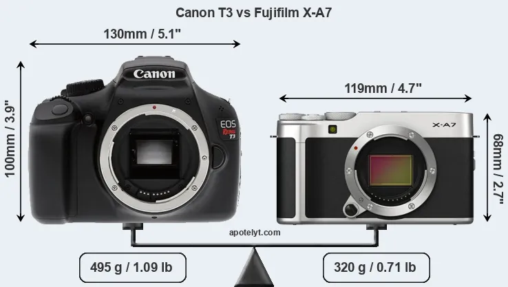 An illustration of the physical size and weight of the Canon T3 and the Fujifilm X-A7 is provided in the side-by-side display below. The two cameras are presented according to their relative size. Three successive views from the front, the top, and the rear are shown. All size dimensions are rounded to the nearest millimeter.