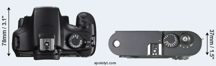 The physical size and weight of the Canon T3 and the Leica M8 are illustrated in the side-by-side display below. The two cameras are presented according to their relative size. Three consecutive perspectives from the front, the top, and the back are available. All size dimensions are rounded to the nearest millimeter.