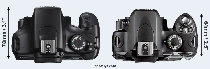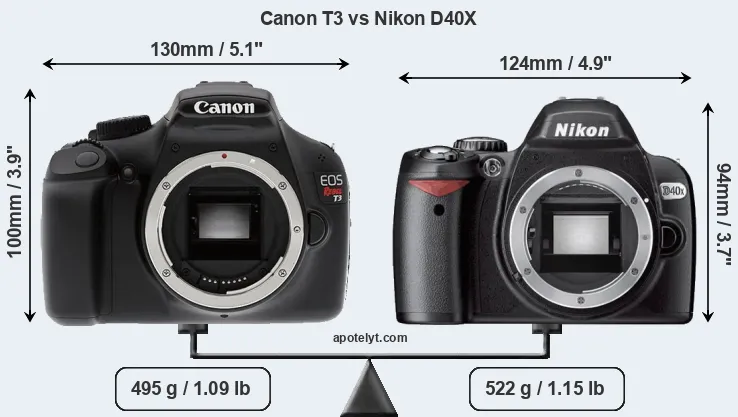 The physical size and weight of the Canon T3 and the Nikon D40X are illustrated in the side-by-side display below. The two cameras are presented according to their relative size. Three successive views from the front, the top, and the rear are shown. All width, height and depth dimensions are rounded to the nearest millimeter.
