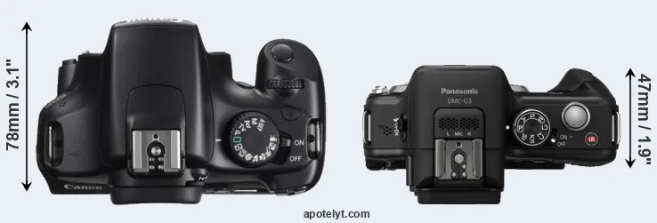 The Canon EOS Rebel T3 (called Canon 1100D in some regions) and the Panasonic Lumix DMC-G3 are two digital cameras that were revealed to the public, respectively, in February 2011 and May 2011. The T3 is a DSLR, while the G3 is a mirrorless interchangeable lens camera. The cameras are based on an APS-C (T3) and a Four Thirds (G3) sensor. The Canon has a resolution of 12.2 megapixels, whereas the Panasonic provides 15.8 MP.