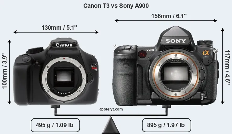 An illustration of the physical size and weight of the Canon T3 and the Sony A900 is provided in the side-by-side display below. The two cameras are presented according to their relative size. Three consecutive perspectives from the front, the top, and the back are available. All width, height and depth dimensions are rounded to the nearest millimeter.