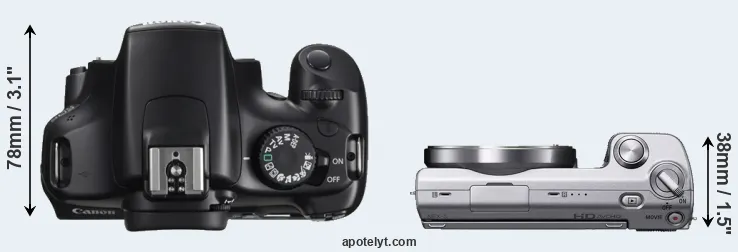 The side-by-side display below illustrates the physical size and weight of the Canon T3 and the Sony NEX-5. The two cameras are presented according to their relative size. Three consecutive views from the front, the top, and the rear side are shown. All width, height and depth measures are rounded to the nearest millimeter.