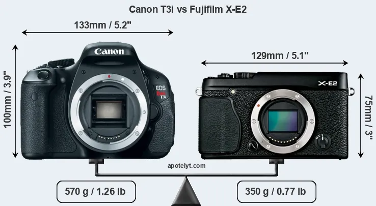 The physical size and weight of the Canon T3i and the Fujifilm X-E2 are illustrated in the side-by-side display below. The two cameras are presented according to their relative size. Three consecutive perspectives from the front, the top, and the back are available. All width, height and depth dimensions are rounded to the nearest millimeter.