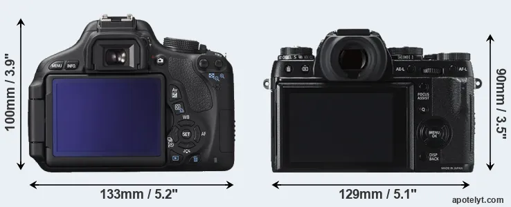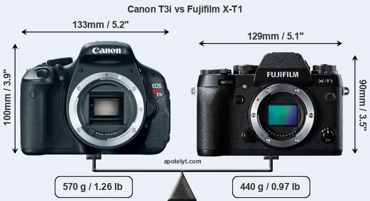 The side-by-side display below illustrates the physical size and weight of the Canon T3i and the Fujifilm X-T1. The two cameras are presented according to their relative size. Three consecutive perspectives from the front, the top, and the back are available. All width, height and depth dimensions are rounded to the nearest millimeter.