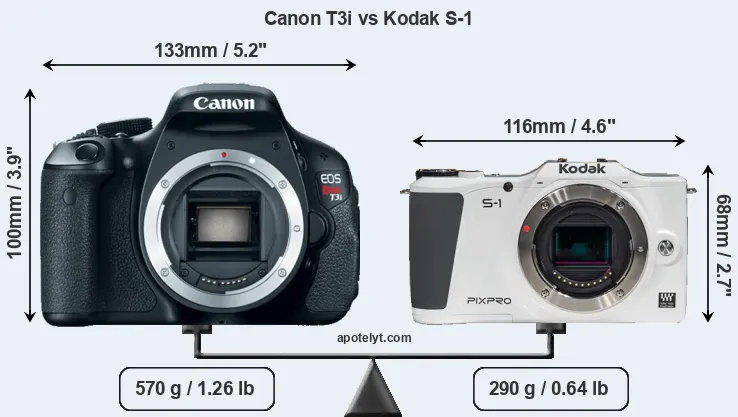 If the front view area (width x height) of the cameras is taken as an aggregate measure of their size, the Kodak S-1 is considerably smaller (41 percent) than the Canon T3i. Moreover, the S-1 is substantially lighter (49 percent) than the T3i. In this context, it is worth noting that neither the T3i nor the S-1 are weather-sealed.