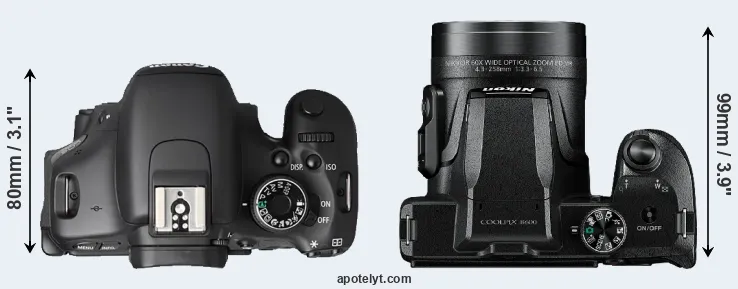 An illustration of the physical size and weight of the Canon T3i and the Nikon B600 is provided in the side-by-side display below. The two cameras are presented according to their relative size. Three consecutive perspectives from the front, the top, and the back are available. All size dimensions are rounded to the nearest millimeter.