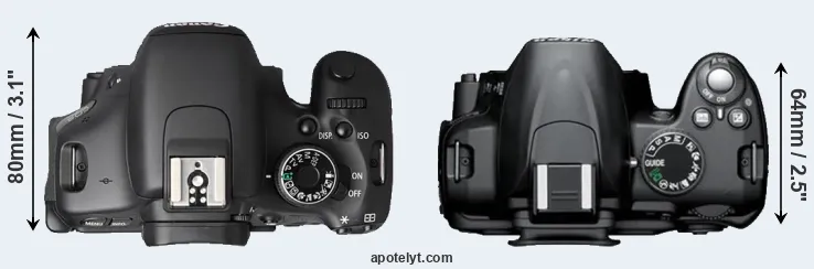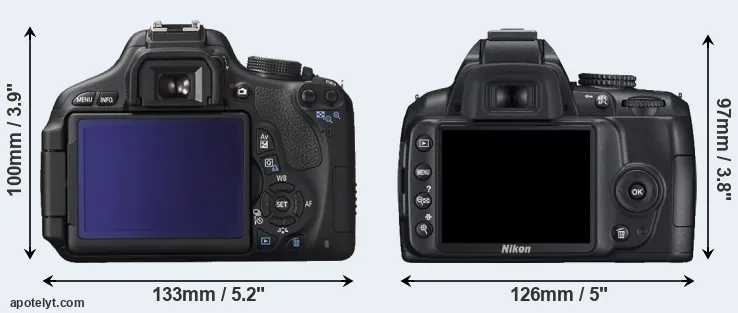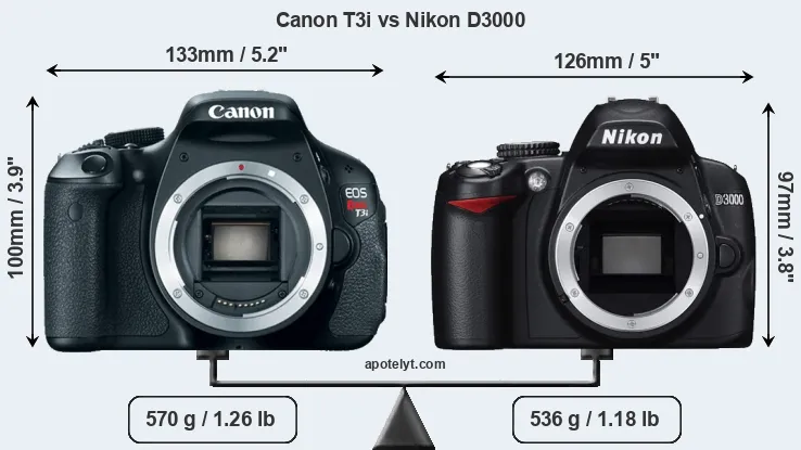 The side-by-side display below illustrates the physical size and weight of the Canon T3i and the Nikon D3000. The two cameras are presented according to their relative size. Three consecutive perspectives from the front, the top, and the back are available. All width, height and depth measures are rounded to the nearest millimeter.