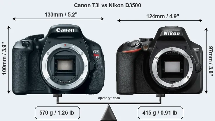 An illustration of the physical size and weight of the Canon T3i and the Nikon D3500 is provided in the side-by-side display below. The two cameras are presented according to their relative size. Three consecutive perspectives from the front, the top, and the back are available. All size dimensions are rounded to the nearest millimeter.