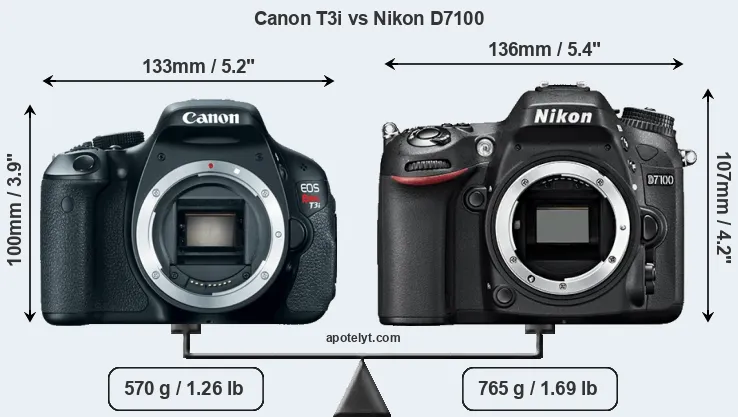 If the front view area (width x height) of the cameras is taken as an aggregate measure of their size, the Nikon D7100 is notably larger (9 percent) than the Canon T3i. Moreover, the D7100 is markedly heavier (34 percent) than the T3i. It is noteworthy in this context that the D7100 is splash and dust-proof, while the T3i does not feature any corresponding weather-sealing.