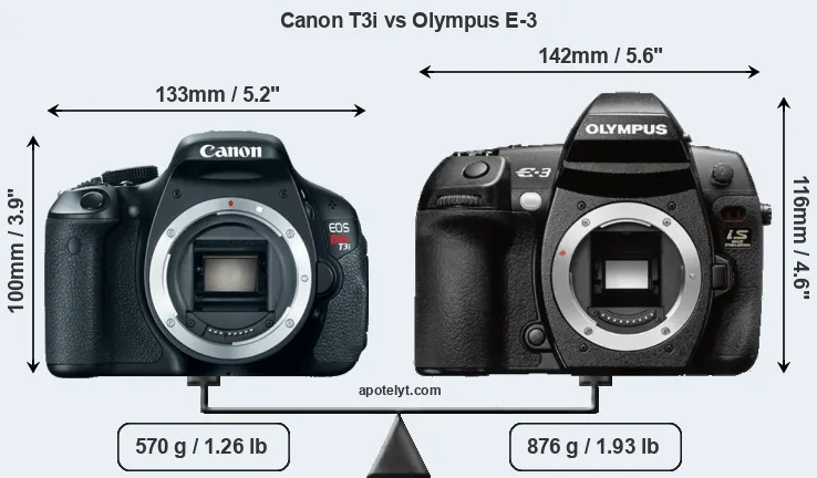 If the front view area (width x height) of the cameras is taken as an aggregate measure of their size, the Olympus E-3 is notably larger (24 percent) than the Canon T3i. Moreover, the E-3 is substantially heavier (54 percent) than the T3i. It is noteworthy in this context that the E-3 is splash and dust-proof, while the T3i does not feature any corresponding weather-sealing.