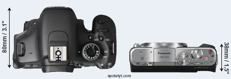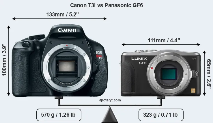 The physical size and weight of the Canon T3i and the Panasonic GF6 are illustrated in the side-by-side display below. The two cameras are presented according to their relative size. Three successive views from the front, the top, and the rear are shown. All width, height and depth dimensions are rounded to the nearest millimeter.