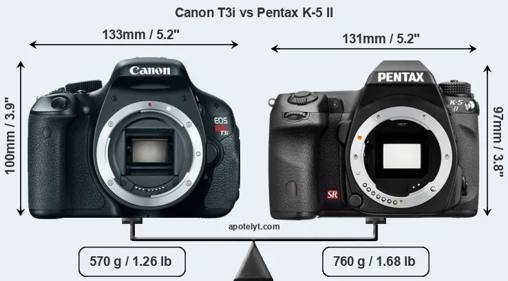 The side-by-side display below illustrates the physical size and weight of the Canon T3i and the Pentax K-5 II. The two cameras are presented according to their relative size. Three successive views from the front, the top, and the rear are shown. All width, height and depth dimensions are rounded to the nearest millimeter.