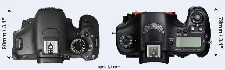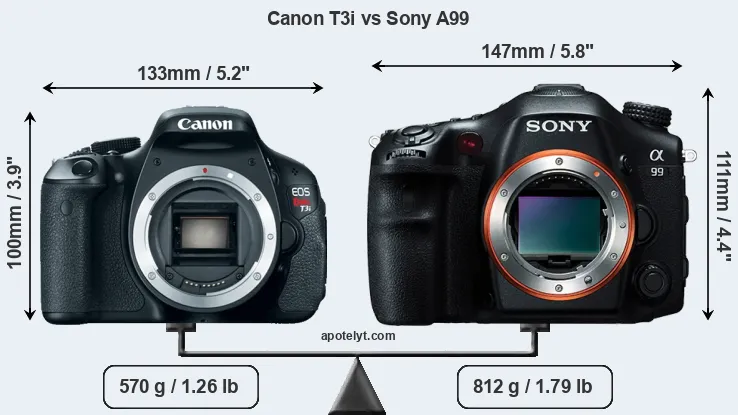The physical size and weight of the Canon T3i and the Sony A99 are illustrated in the side-by-side display below. The two cameras are presented according to their relative size. Three successive views from the front, the top, and the rear are shown. All width, height and depth measures are rounded to the nearest millimeter.