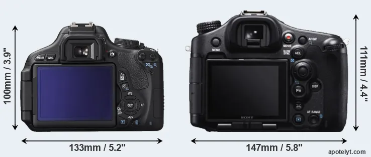 The Canon EOS Rebel T3i (called Canon 600D in some regions) and the Sony Alpha SLT-A99 are two digital cameras that were revealed to the public, respectively, in February 2011 and September 2012. Both are DSLR (Digital Single Lens Reflex) cameras that are based on an APS-C (T3i) and a full frame (A99) sensor. The Canon has a resolution of 17.9 megapixels, whereas the Sony provides 24 MP.