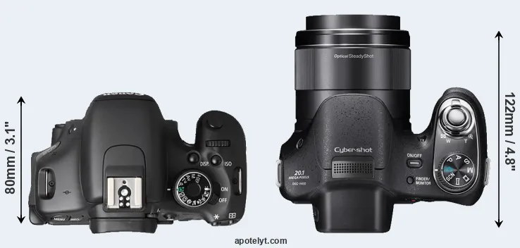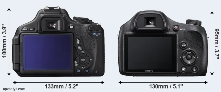 The physical size and weight of the Canon T3i and the Sony H400 are illustrated in the side-by-side display below. The two cameras are presented according to their relative size. Three successive views from the front, the top, and the rear are shown. All width, height and depth measures are rounded to the nearest millimeter.