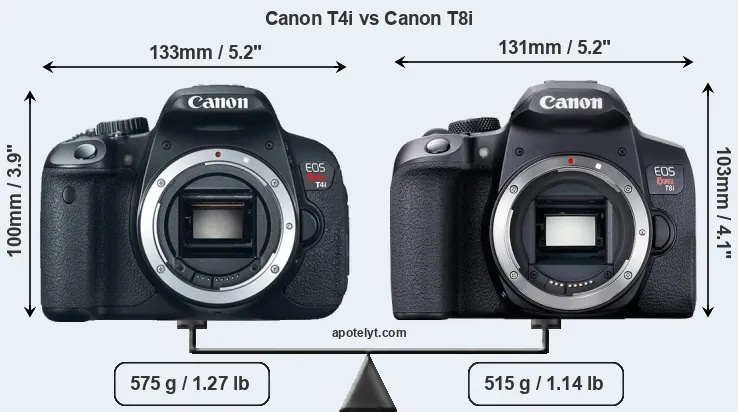 An illustration of the physical size and weight of the Canon T4i and the Canon T8i is provided in the side-by-side display below. The two cameras are presented according to their relative size. Three successive views from the front, the top, and the rear are shown. All width, height and depth dimensions are rounded to the nearest millimeter.