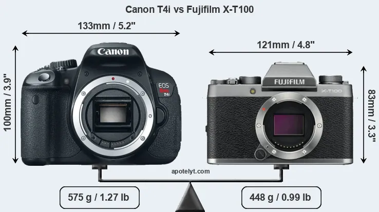 The physical size and weight of the Canon T4i and the Fujifilm X-T100 are illustrated in the side-by-side display below. The two cameras are presented according to their relative size. Three consecutive views from the front, the top, and the rear side are shown. All width, height and depth dimensions are rounded to the nearest millimeter.