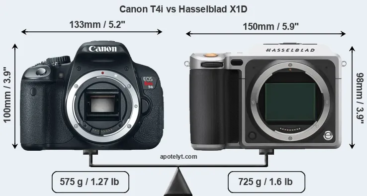 An illustration of the physical size and weight of the Canon T4i and the Hasselblad X1D is provided in the side-by-side display below. The two cameras are presented according to their relative size. Three consecutive perspectives from the front, the top, and the back are available. All width, height and depth dimensions are rounded to the nearest millimeter.
