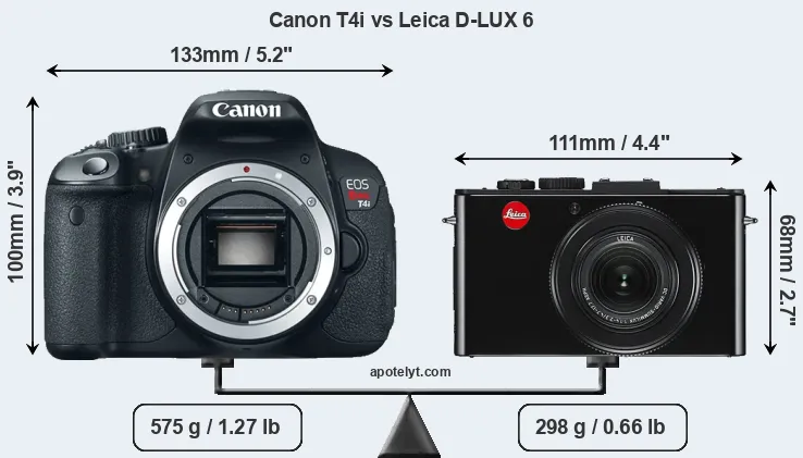 The side-by-side display below illustrates the physical size and weight of the Canon T4i and the Leica D-LUX 6. The two cameras are presented according to their relative size. Three consecutive perspectives from the front, the top, and the back are available. All width, height and depth measures are rounded to the nearest millimeter.